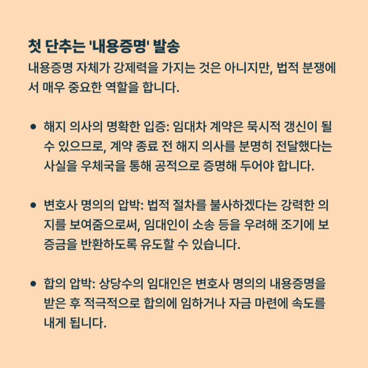 합의 압박: 상당수의 임대인은 변호사 명의의 내용증명을 받은 후 적극적으로 합의에 임하거나 자금 마련에 속도를 내게 됩니다.