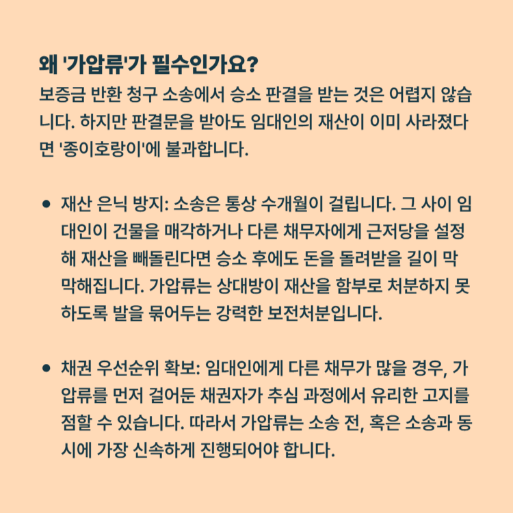 재산 은닉 방지: 소송은 통상 수개월이 걸립니다. 그 사이 임대인이 건물을 매각하거나 다른 채무자에게 근저당을 설정해 재산을 빼돌린다면 승소 후에도 돈을 돌려받을 길이 막막해집니다. 가압류는 상대방이 재산을 함부로 처분하지 못하도록 발을 묶어두는 강력한 보전처분입니다.