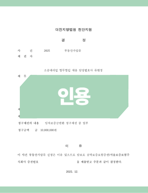 법원은 새움의 주장을 받아들여 B씨 소유 부동산에 대한 가압류 결정을 내렸습니다. 재산권 행사에 제약이 생긴 B씨는 결국 심리적 압박을 견디지 못하고 A씨에게 잔여 보증금을 전액 반환하며 사건이 원만히 해결되었습니다.