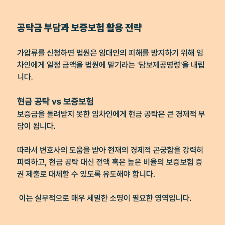 보증금을 돌려받지 못한 임차인에게 현금 공탁은 큰 경제적 부담이 됩니다. 따라서 변호사의 도움을 받아 현재의 경제적 곤궁함을 강력히 피력하고, 현금 공탁 대신 전액 혹은 높은 비율의 보증보험 증권 제출로 대체할 수 있도록 유도해야 합니다. 이는 실무적으로 매우 세밀한 소명이 필요한 영역입니다.