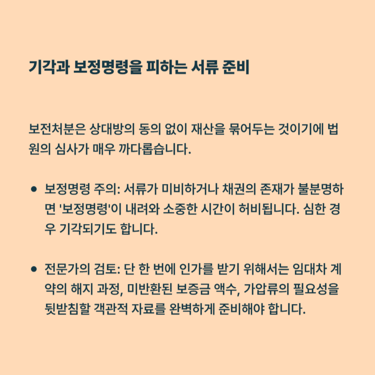 보정명령 주의: 서류가 미비하거나 채권의 존재가 불분명하면 '보정명령'이 내려와 소중한 시간이 허비됩니다. 심한 경우 기각되기도 합니다.