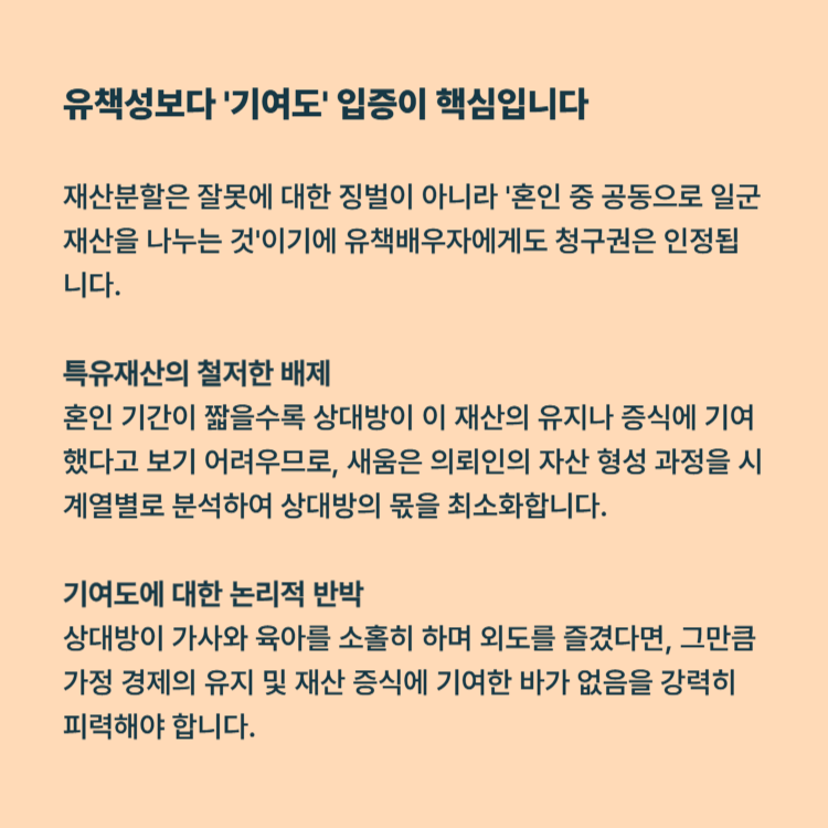 기여도에 대한 논리적 반박: 상대방이 가사와 육아를 소홀히 하며 외도를 즐겼다면, 그만큼 가정 경제의 유지 및 재산 증식에 기여한 바가 없음을 강력히 피력해야 합니다. 유책 사유 자체가 분할 비율을 결정하는 절대적 기준은 아니지만, 기여도를 산정할 때 참작 사유로 활용될 수 있습니다.