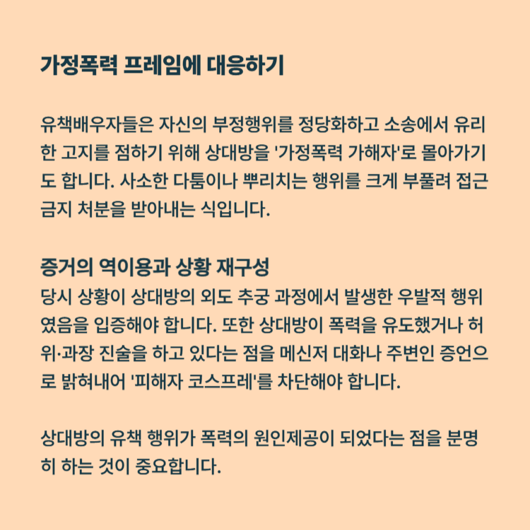 유책배우자들은 자신의 부정행위를 정당화하고 소송에서 유리한 고지를 점하기 위해 상대방을 '가정폭력 가해자'로 몰아가기도 합니다. 사소한 다툼이나 뿌리치는 행위를 크게 부풀려 접근금지 처분을 받아내는 식입니다.