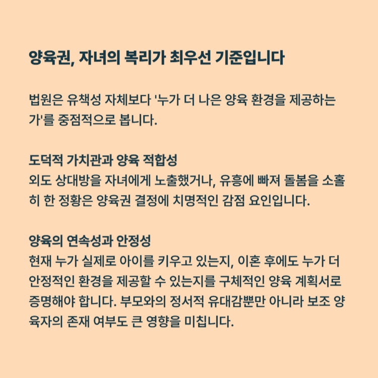 도덕적 가치관과 양육 적합성: 외도 상대방을 자녀에게 노출했거나, 유흥에 빠져 돌봄을 소홀히 한 정황은 양육권 결정에 치명적인 감점 요인입니다.