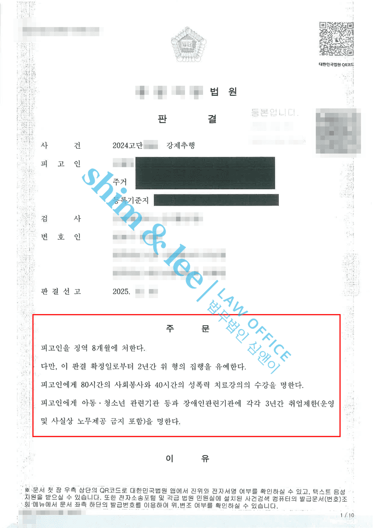 - 최종적으로 재판부는 가해자에게 징역 8개월, 집행유예 2년, 사회봉사 80시간, 성폭력 치료강의 40시간, 취업제한 3년을 선고했습니다.