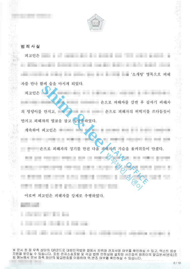 - 가해자는 총 6차례에 걸친 공판에서 피해자와 서로 호감이 있는 상태에서 자연스럽게 이루어진 스킨십이었을 뿐이며 피해자가 소개팅 주선자와 주변의 시선을 의식해 허위, 과장하여 신고했다며 범행을 부인했습니다. 심앤이는 선고기일을 앞두고 최종 변호사 의견서를 제출하여 가해자의 주장이 객관적 사실관계와 증거에 전혀 부합하지 않으며 피해자의 행위가 무고로 볼 수 없다는 점을 구체적으로 반박했습니다.