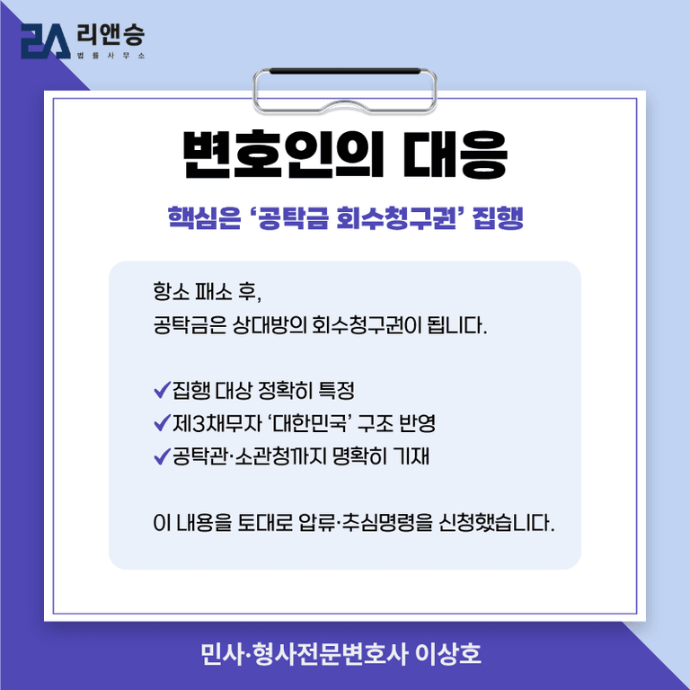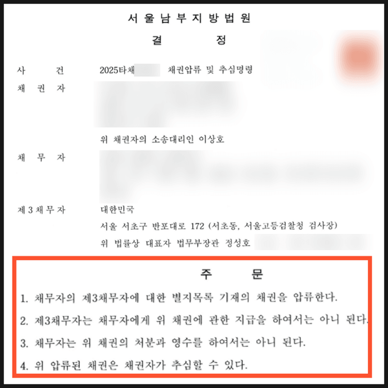 항소심 판결 직후, 저는 즉시 공탁금 회수청구권에 대한 압류·추심 절차를 진행했습니다.