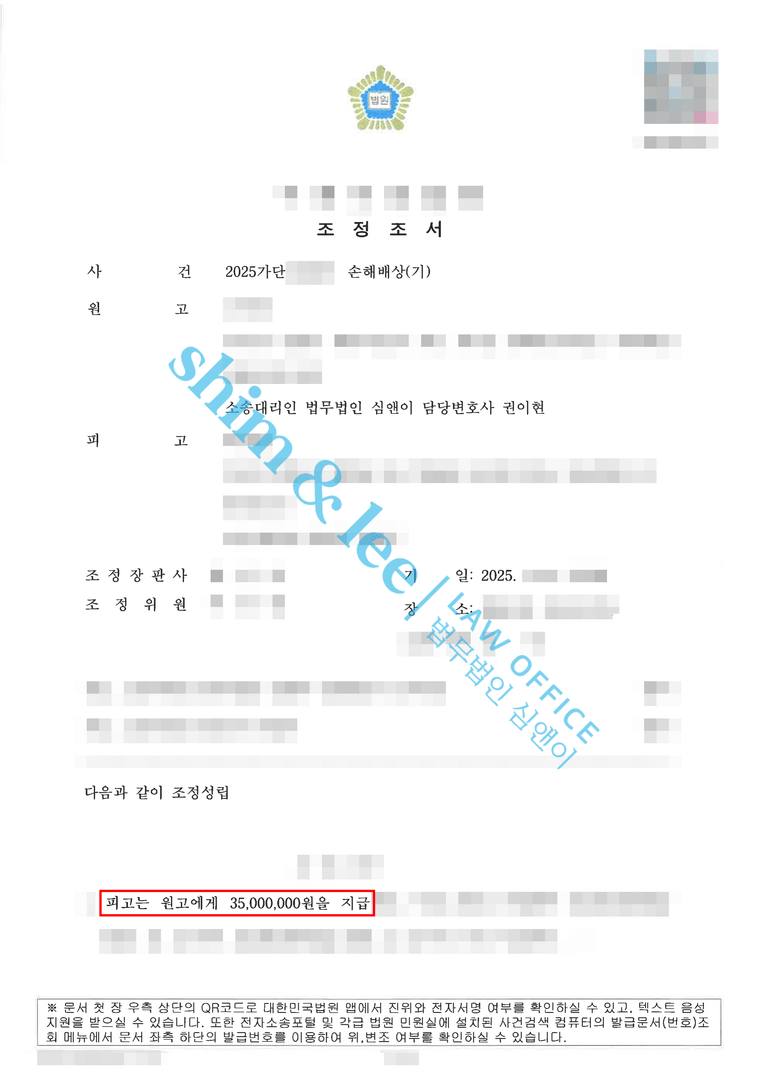 - 심앤이의 단호하고 논리적인 주장에 조정이 결렬될 것을 우려한 피고는 결국 심앤이의 뜻에 따라 처음 제시한 금액에서 약 3배 넘게 증액한 청구금액 3,500만 원을 전액 지급하겠다는 조정안을 제시하였고, 극적으로 조정이 성립되었습니다.