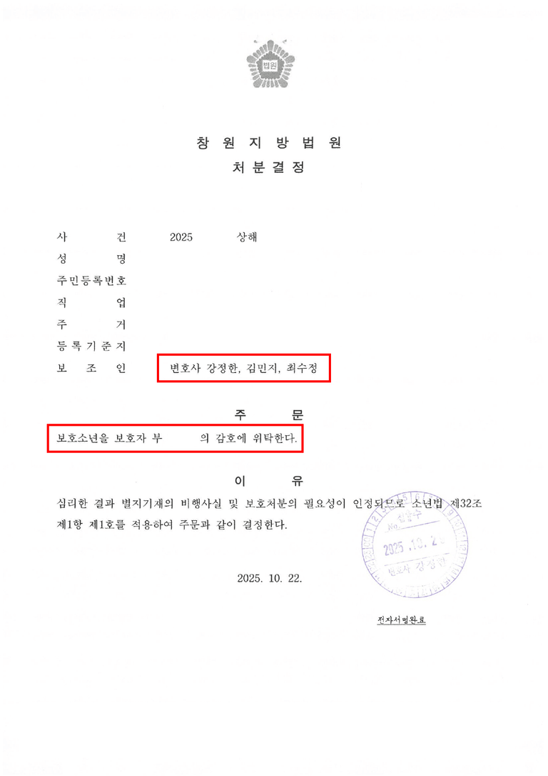 진앤솔 법률사무소의 조력을 통해 비교적 가벼운 보호처분으로 마무리된 사례입니다.
