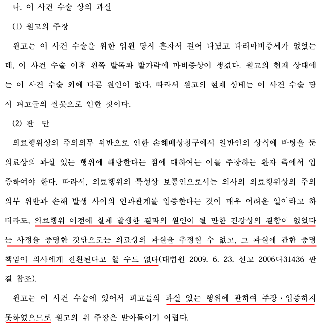 재판부는"의료 행위 이전에 실제 발생한 결과(이 사건에서는 왼쪽 발목과 발가락의 마비 증상)의 원인이 될 만한 건강상의 결함이 없었다는 사정을 증명한 것만으로는 의료상의 과실을 추정할 수 없고, 그 과실에 관한 증명책임이 의사에게 전환된다고 할 수 없다"라는 이유로 피고의 의료과실을 주장·입증하지 못한 원고의 주장을 받아들이지 않았습니다.