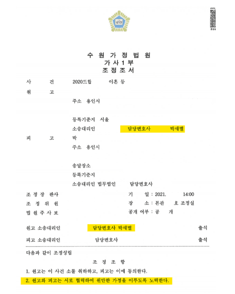 재판부는 조정기일에서 합의서의 내용을 확인 한 후 제가 작성한 합의서 초안 내용 그대로 조정조서를 작성하여 주었습니다(더 상세한 조정조서의 내용은 개인정보 문제로 인하여 공개하지 않았습니다, 진행 내용을 알고 싶으시다면 상담 문의 주세요).