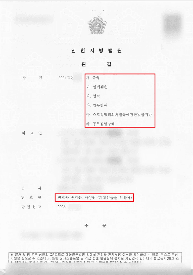 이에 의뢰인과 향후 재판절차 진행 방향에 대해 논의한 이후 철저하게 증인신문 절차를 준비하였고, 종국적으로는 업무방해, 스토킹처벌법위반 혐의에 대해서는 무죄판결을 선고받을 수 있었습니다.