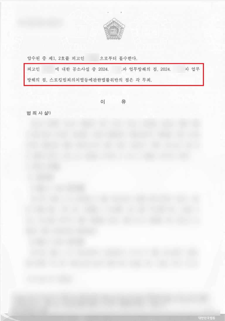 ■ 결과 : 업무방해, 스토킹범죄의처벌등에관한법률위반 무죄