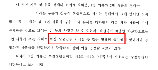 법원은 피신청인들의 주장을 그대로 받아들여 동종상품이 통상적으로 가지는 형태에서 크게 벗어난 것이라고 볼 수 없고, 1번 의류의 경우 그와 유사한 디자인의 다른 회사 제품이 이미 존재하는 것으로 보이는 점 등을 종합하여 신청인 A의 1번 의류가 외관자체로 특정한 상품임을 인식할 수 있는 형태적 특이성이 있다거나 정형화된 상품임을 인정하기 부족하므로, 부정경쟁방지법 제2조 제1호 '자'목에서 보호되는 상품형태에 해당한다고 보기 어렵다고 판단하였습니다.