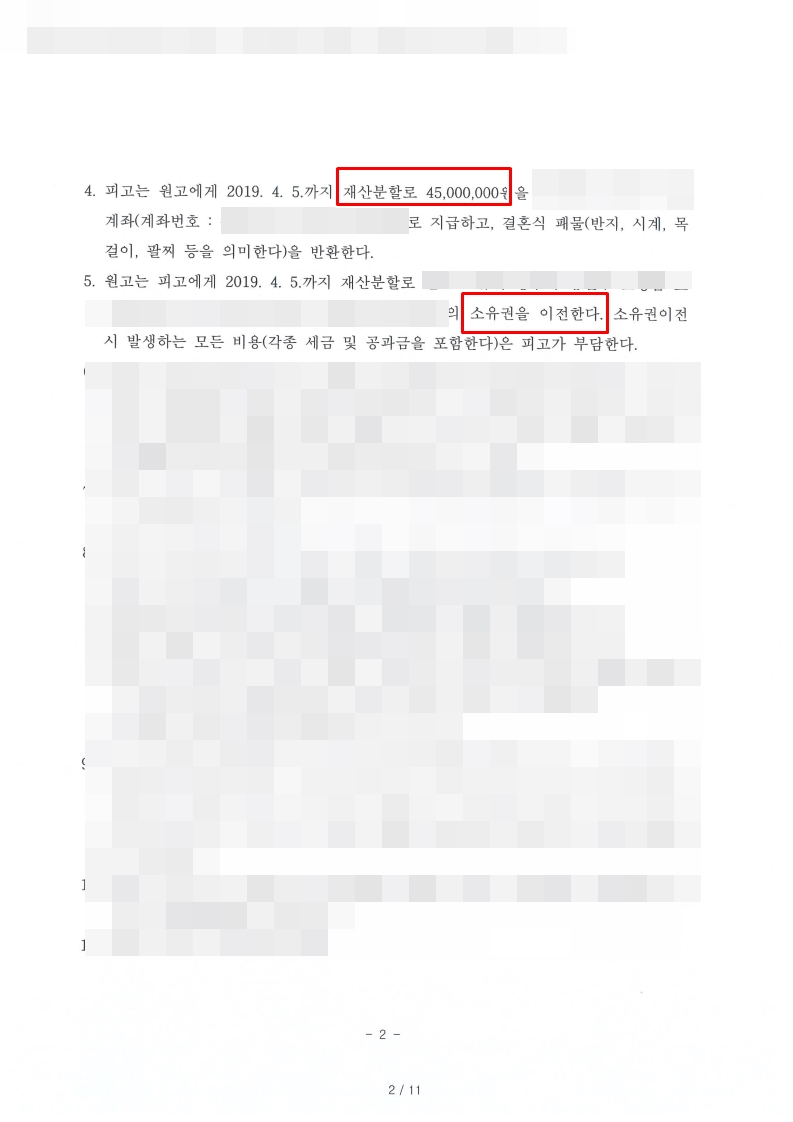 또한 재산분할이 중요한 사건이였는데 피고는 거주하고 있는 아파트를 분할 받고 대신 원고에게 4500만원을 지급하기로 하는 판결은 받아