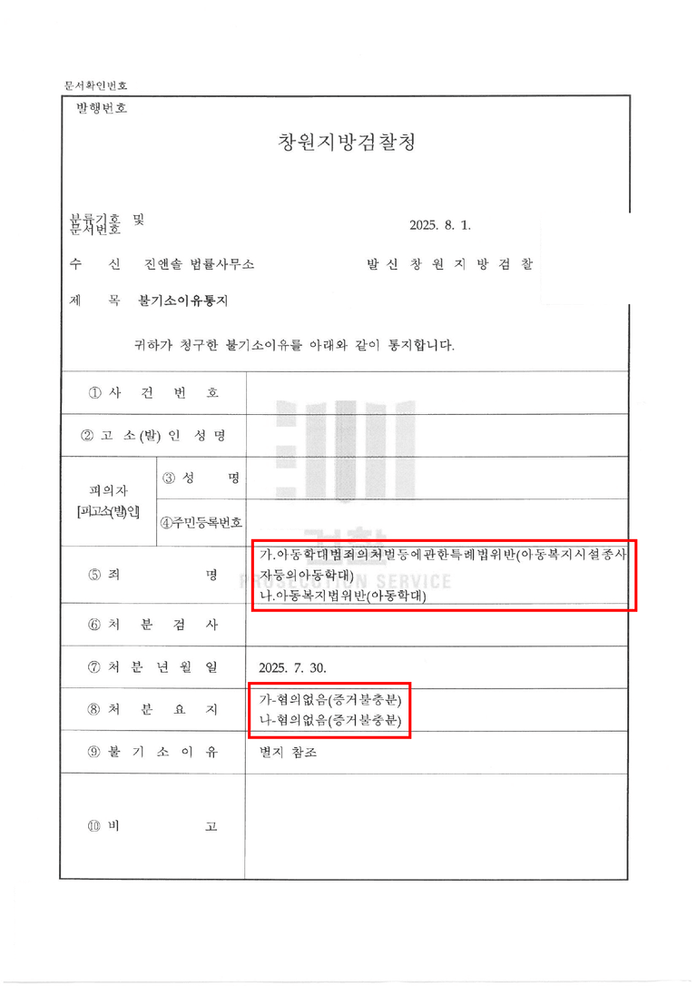 진앤솔 법률사무소의 위와같은 조력의 결과, 수사기관은 지속적·고의적 학대라고 볼 증거가 부족하다고 보아 불기소(혐의없음)를 결정했습니다.