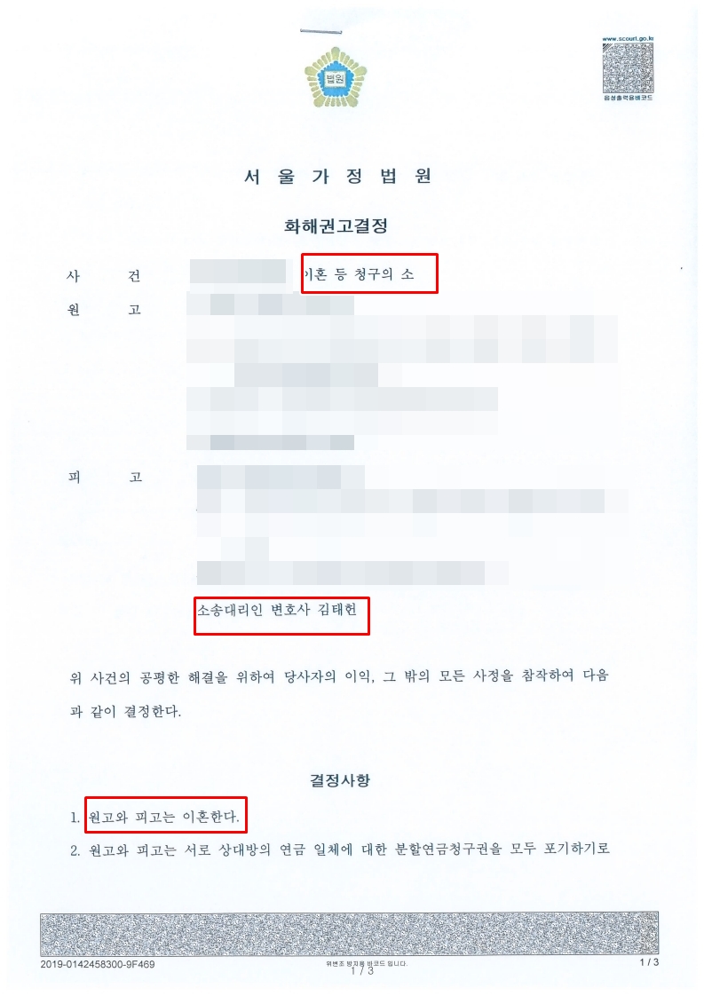 수원/용인/성남/화성 김태헌 변호사는 피고측의 변론을 맡아 결국 이혼이 인정되었고 재산분할은 각자 분할하기로 하였습니다.