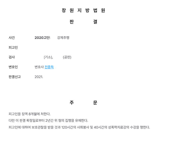 피고인은 형법 제298조에 따라 처벌되었으며, 형법 제62조 제1항에 따라 집행유예가 적용되었습니다. 또한 형법 제62조의2에 따른 보호관찰 및 사회봉사명령, 성폭력범죄의 처벌 등에 관한 특례법 제16조 제2항에 따른 수강명령이 부과되었습니다.