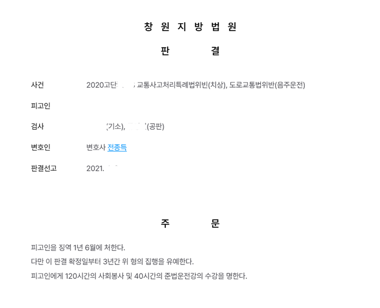 피고인은 2014년 9월 15일 창원지방법원에서 도로교통법위반(음주운전)죄로 벌금 500만 원의 약식명령을 받은 전력이 있음