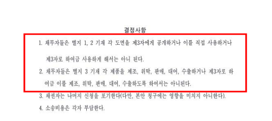 법원은 위반행위 당 1억원의 간접강제 신청만을 제외하고 신청인의 주장을 전부 수용하여 화해권고결정을 내렸고, 양 당사자가 이의하지 않아 화해권고결정은 그대로 확정되었습니다. 이를 통해 피신청인들의 도면 사용 및 제품 제조·판매를 즉시 중단시키킬 수 있었고, 사실상 신청인의 소중한 권리를 완벽히 보호받으며 사건을 마무리할 수 있었습니다.