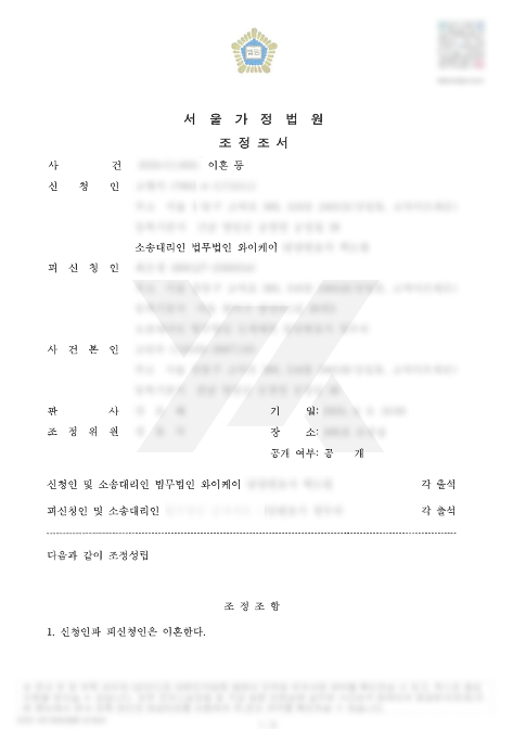 법무법인 YK는 조정신청 단계부터 신중하고 전략적으로 대응하였습니다. 이혼 사유는 구체적으로 명시하지 않고, 상대방을 자극하지 않으면서도 의뢰인의 입장을 분명히 전달하는 방식으로 조정서를 구성하였으며, 조정기일 전 수차례에 걸쳐 의뢰인과 협의하여 조정안의 마지노선을 정리했습니다.