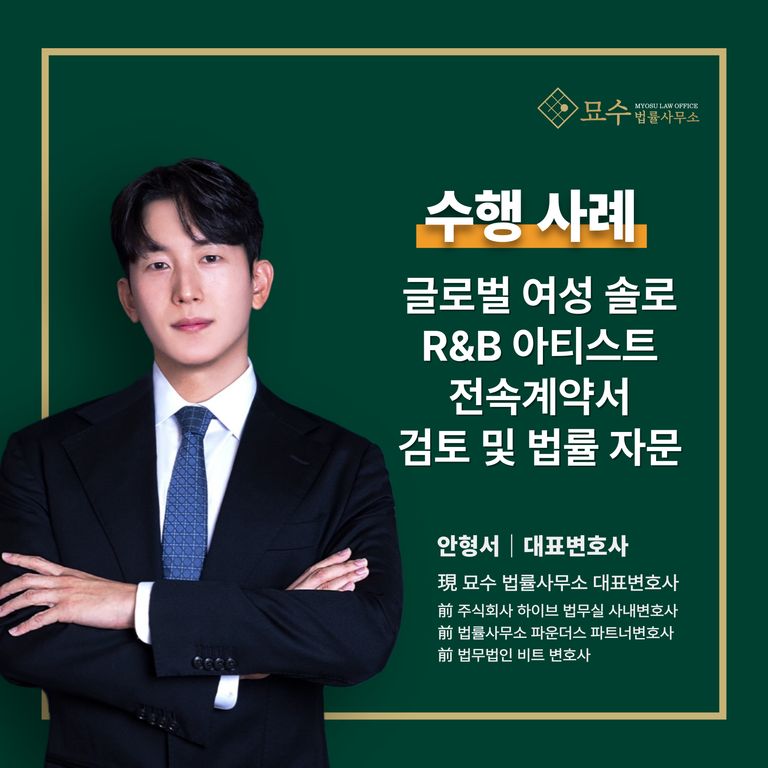 묘수 법률사무소의 안형서 대표 변호사는 글로벌 대형 엔터테인먼트 기업 법무실에서의 다년간의 실무 경험을 바탕으로, 국내 기반 아티스트뿐만 아니라 해외를 중심으로 활동하거나 국내외를 넘나들며 활동하는 아티스트·인플루언서·e스포츠 선수에 대한 법률 자문을 폭넓게 수행하고 있습니다. 최근 중국 인플루언서 전속계약 자문, 일본 언론 리스크 대응 등 해외 엔터테인먼트와 관련한 법률 자문을 수행한 바 있습니다.