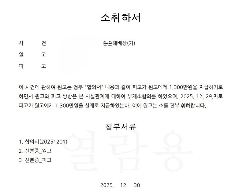 이에 소취하서를 제출하여 소송이 종결되었습니다.