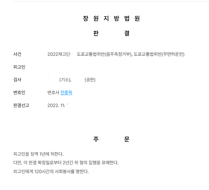 본 판결은 도로교통법위반(음주측정거부) 및 도로교통법위반(무면허운전) 혐의로 기소된 피고인 A에 대한 창원지방법원의 판결입니다. 법원은 피고인에게 징역 1년에 집행유예 2년 및 120시간의 사회봉사를 명령했습니다.