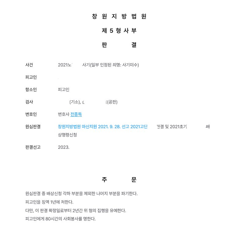 피고인에게 징역 1년, 집행유예 2년, 사회봉사 80시간을 선고했습니다.