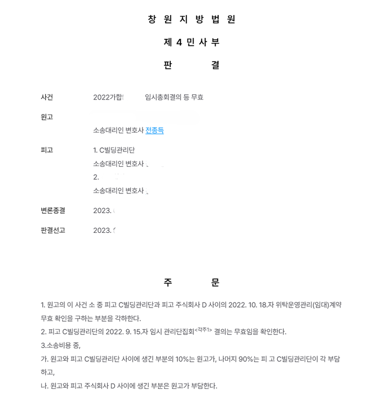 본 사건은 주식회사 A(원고)가 C빌딩관리단(피고1)의 2022년 9월 15일 임시 관리단집회 결의의 무효 확인과 피고1과 주식회사 D(피고2) 사이의 위탁운영관리(임대)계약 무효 확인을 구하는 소송입니다.
