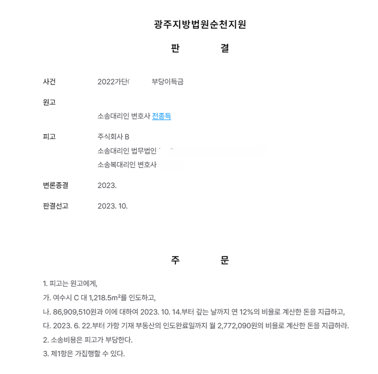 본 사건은 원고 A가 소유한 여수시 C 대 1,218.5㎡ 토지를 피고 주식회사 B가 무단으로 호텔 주차장으로 사용한 것에 대해 토지 반환 및 부당이득금 지급을 청구한 사안입니다.