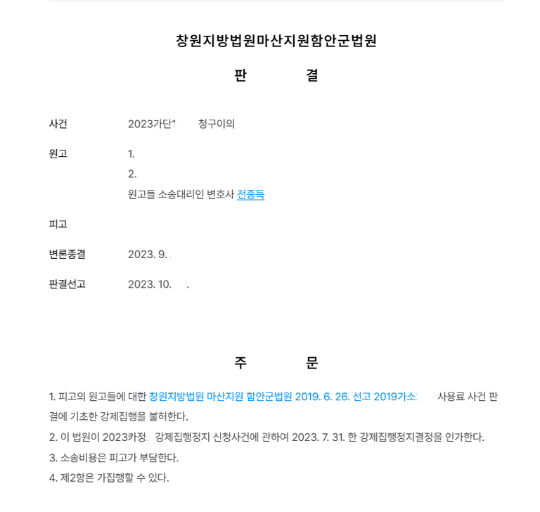 법원은 피고의 원고들에 대한 강제집행을 불허하고, 강제집행정지결정을 인가하며, 소송비용은 피고가 부담하도록 판결했습니다.