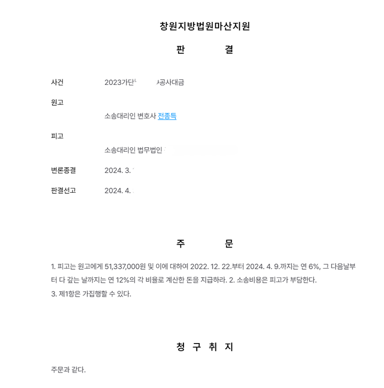 법원은 피고의 감정결과에 대한 이의를 배척하고, 공사대금 120,185,000원에서 기지급 공사대금 50,000,000원과 하자보수비용 18,848,000원을 공제한 51,337,000원 및 지연손해금의 지급을 명령했습니다.