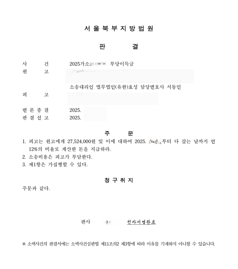 저는 즉각 입금 받은 자를 피고로 하여 민사소송 부당이득반환청구소송을 제기하였고 법원은 원고 승소 판결을 선고하여 의뢰인은 피해액을 반환받았습니다.