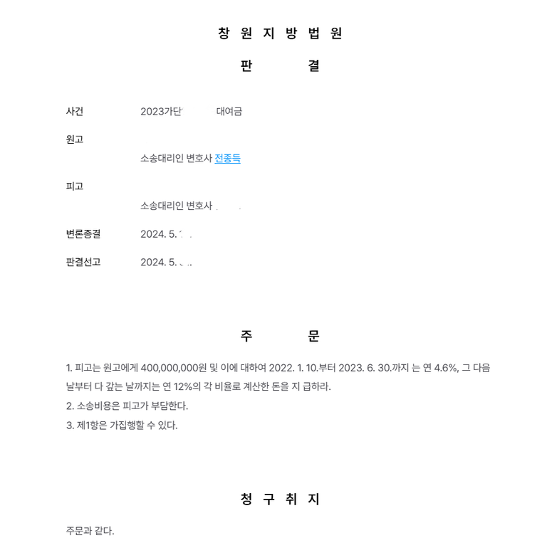 법원은 원고의 청구를 인용하여 피고에게 4억 원 및 이에 대한 이자(2022.1.10.부터 2023.6.30.까지 연 4.6%, 그 다음날부터 완제일까지 연 12%)를 지급하도록 명령했습니다. 소송비용은 피고가 부담하며, 판결은 가집행할 수 있습니다.