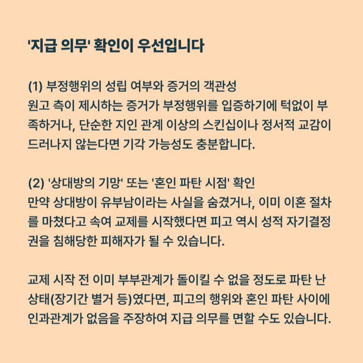 만약 상대방이 유부남이라는 사실을 숨겼거나, 이미 이혼 절차를 마쳤다고 속여 교제를 시작했다면 피고 역시 성적 자기결정권을 침해당한 피해자가 될 수 있습니다. 또한, 교제 시작 전 이미 부부관계가 돌이킬 수 없을 정도로 파탄 난 상태(장기간 별거 등)였다면, 피고의 행위와 혼인 파탄 사이에 인과관계가 없음을 주장하여 지급 의무를 면할 수도 있습니다.