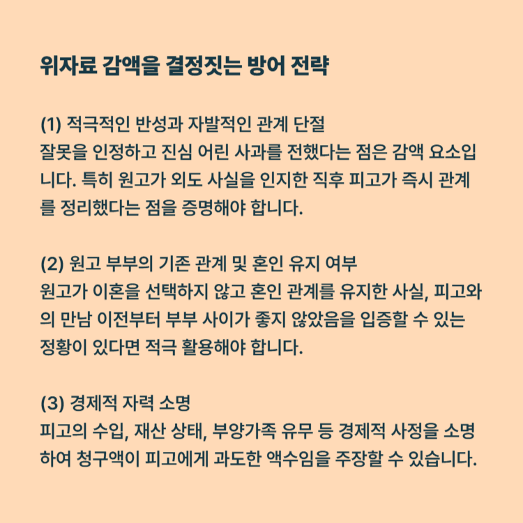 원고가 이혼을 선택하지 않고 혼인 관계를 유지한다면, 피고가 지급해야 할 위자료는 이혼하는 경우보다 낮게 책정되는 것이 일반적입니다. 또한, 피고와의 만남 이전부터 부부 사이가 좋지 않았음을 입증할 수 있는 정황(잦은 다툼, 각방 등)이 있다면 이를 적극적으로 활용해야 합니다.
