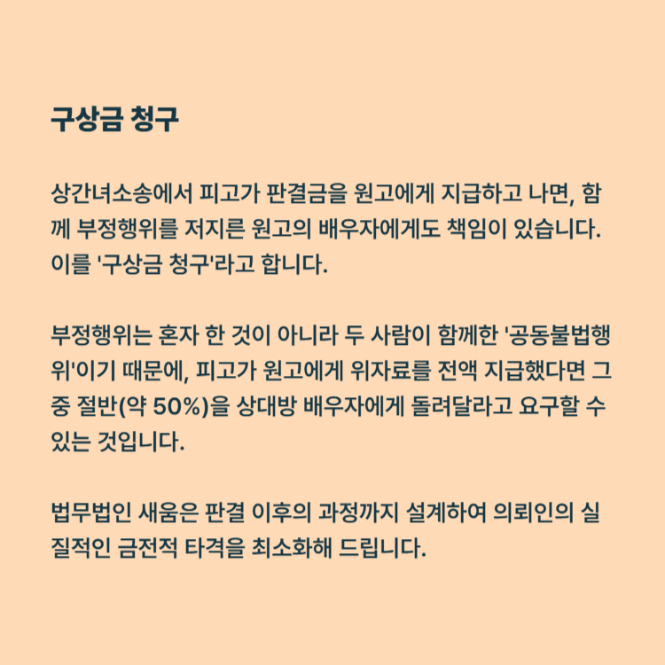 부정행위는 혼자 한 것이 아니라 두 사람이 함께한 '공동불법행위'이기 때문에, 피고가 원고에게 위자료를 전액 지급했다면 그중 절반(약 50%)을 상대방 배우자에게 돌려달라고 요구할 수 있는 것입니다. 법무법인 새움은 판결 이후의 과정까지 설계하여 의뢰인의 실질적인 금전적 타격을 최소화해 드립니다.
