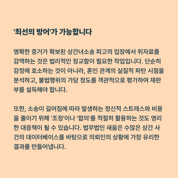 또한, 소송이 길어짐에 따라 발생하는 정신적 스트레스와 비용을 줄이기 위해 '조정'이나 '합의'를 적절히 활용하는 것도 영리한 대응책이 될 수 있습니다. 법무법인 새움은 수많은 상간 사건의 데이터베이스를 바탕으로 의뢰인의 상황에 가장 유리한 결과를 만들어냅니다.