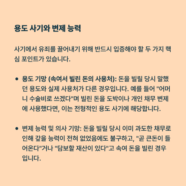 용도 기망 (속여서 빌린 돈의 사용처): 돈을 빌릴 당시 말했던 용도와 실제 사용처가 다른 경우입니다. 예를 들어 "어머니 수술비로 쓰겠다"며 빌린 돈을 도박이나 개인 채무 변제에 사용했다면, 이는 전형적인 용도 사기에 해당합니다.