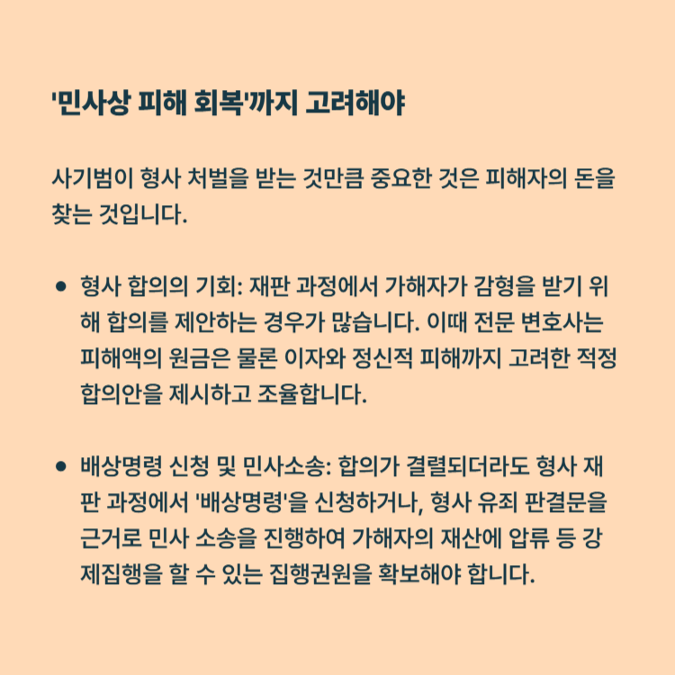 형사 합의의 기회: 재판 과정에서 가해자가 감형을 받기 위해 합의를 제안하는 경우가 많습니다. 이때 전문 변호사는 피해액의 원금은 물론 이자와 정신적 피해까지 고려한 적정 합의안을 제시하고 조율합니다.