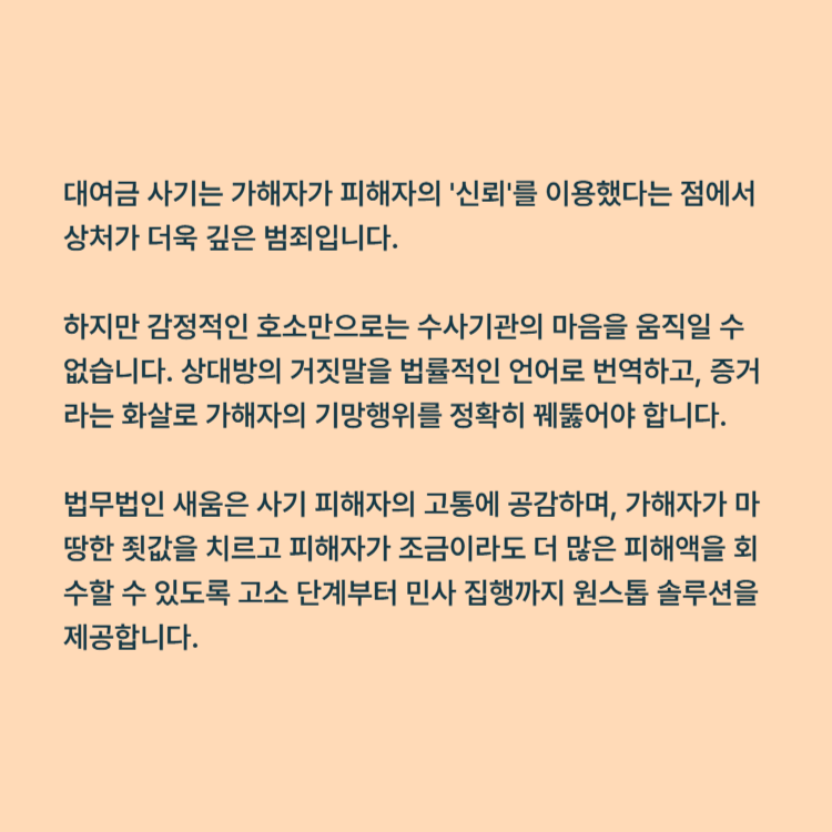 법무법인 새움은 사기 피해자의 고통에 공감하며, 가해자가 마땅한 죗값을 치르고 피해자가 조금이라도 더 많은 피해액을 회수할 수 있도록 고소 단계부터 민사 집행까지 원스톱 솔루션을 제공합니다.