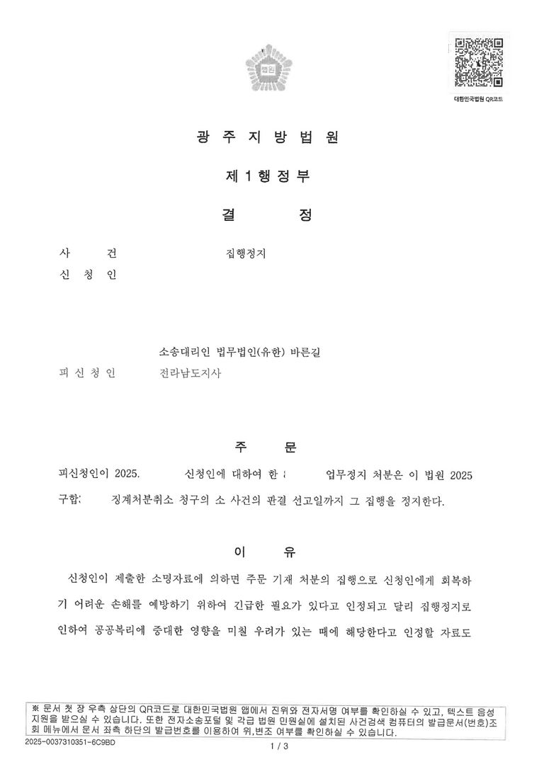 안녕하세요 광주 변호사 안준표입니다. 오늘은 지방자치단체가 내린 ‘업무정지(12개월)’ 징계처분에 대해, 본안 소송과 함께 집행정지 인용 결정을 이끌어낸 사례를 익명화하여 소개드립니다.
