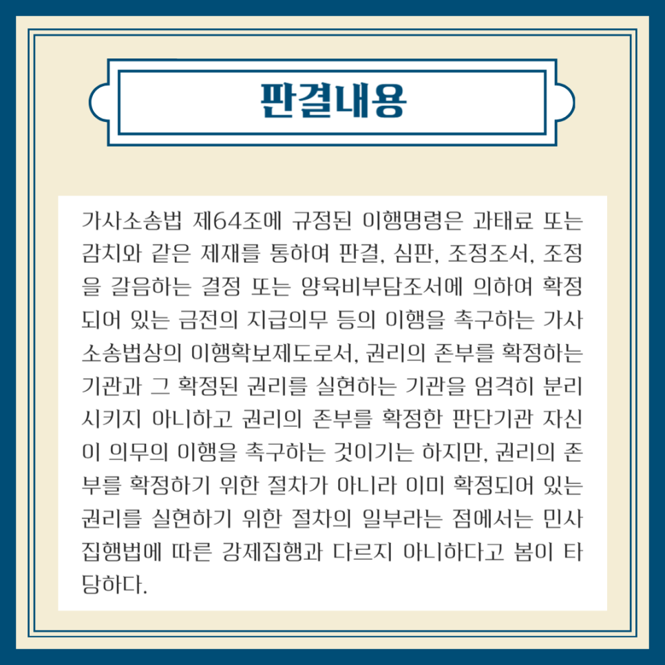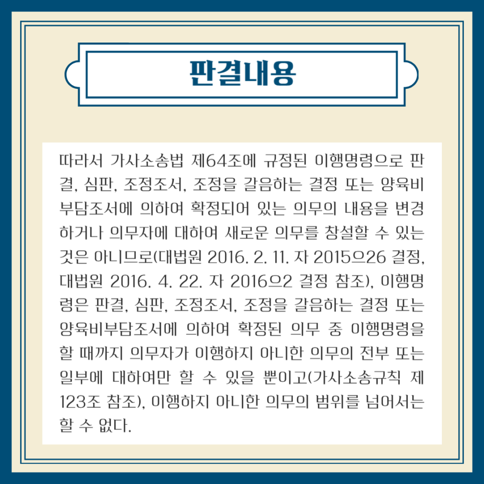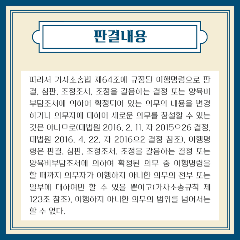 가사소송법 제64조에 근거해, 이행명령은 이미 확정된 의무(판결, 심판, 조정조서, 양육비 부담조서 등)에 대해 미이행된 범위 내에서만 내릴 수 있으며, 확정된 의무를 넘어서는 새로운 의무를 만들거나 금액을 변경할 수 없다.