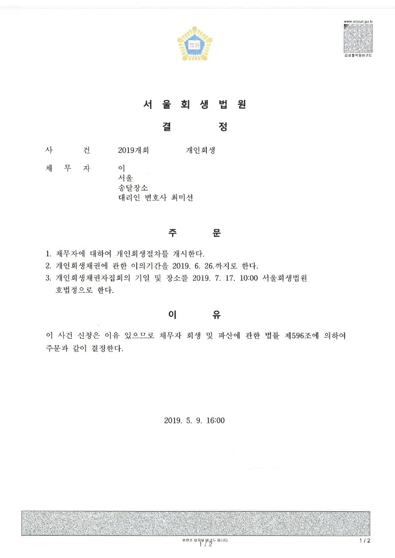 결국, 모든 사업을 정리하고, 작은 가게의 관리 직원으로 취직을 하시면서 개인회생을 신청하게 되었습니다.