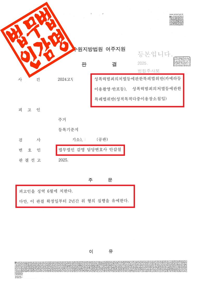 불법 촬영을 포함해 모든 성범죄에서 재범이 발생했다면, 지체하지 말고 반드시 성범죄 전문가와 상담부터 진행하시길 바랍니다.