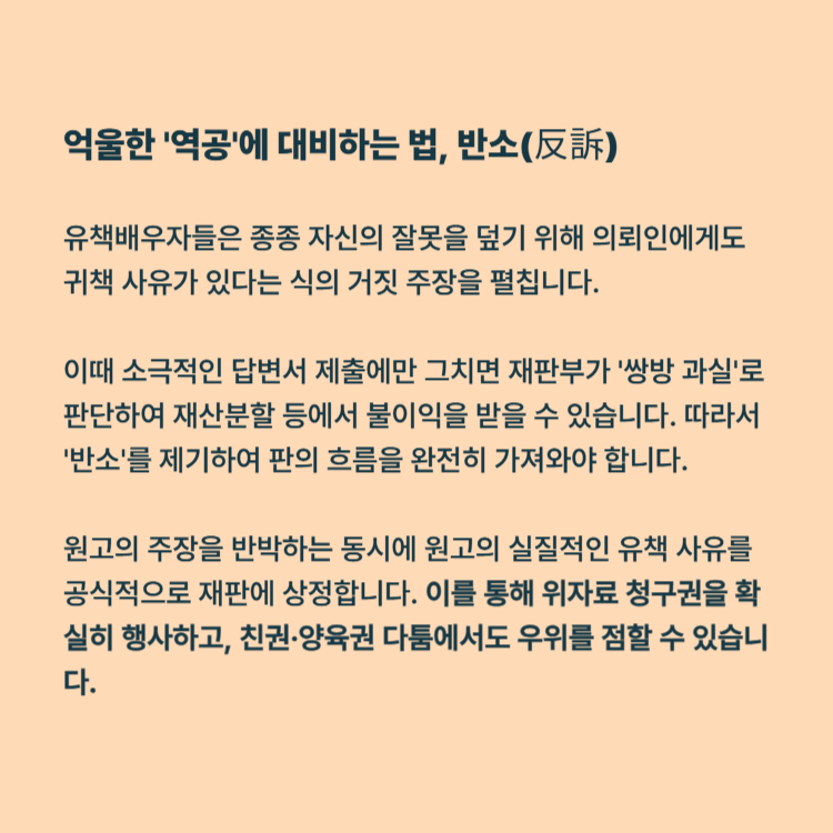 이때 소극적인 답변서 제출에만 그치면 재판부가 '쌍방 과실'로 판단하여 재산분할 등에서 불이익을 받을 수 있습니다. 따라서 '반소'를 제기하여 판의 흐름을 완전히 가져와야 합니다.