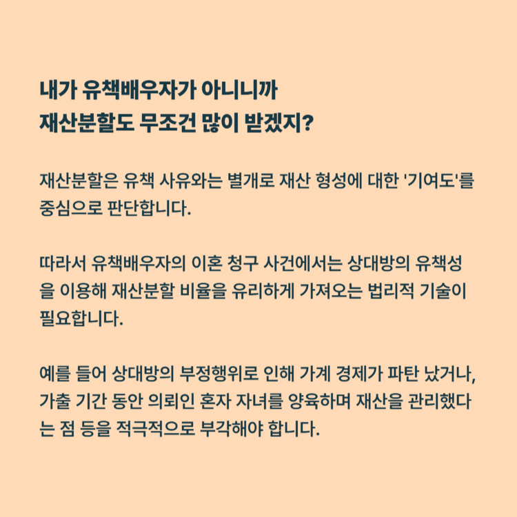 많은 분이 "내가 유책배우자가 아니니 재산분할도 무조건 많이 받겠지"라고 오해하십니다. 하지만 재산분할은 유책 사유와는 별개로 재산 형성에 대한 '기여도'를 중심으로 판단합니다.