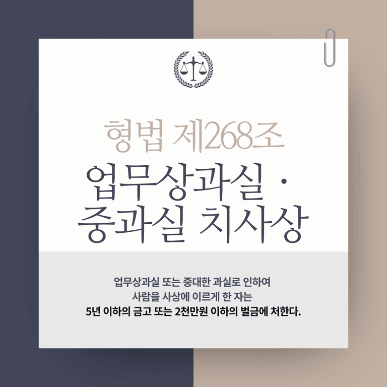 제268조(업무상과실ㆍ중과실 치사상) 업무상과실 또는 중대한 과실로 인하여 사람을 사상에 이르게 한 자는 5년 이하의 금고 또는 2천만원 이하의 벌금에 처한다.