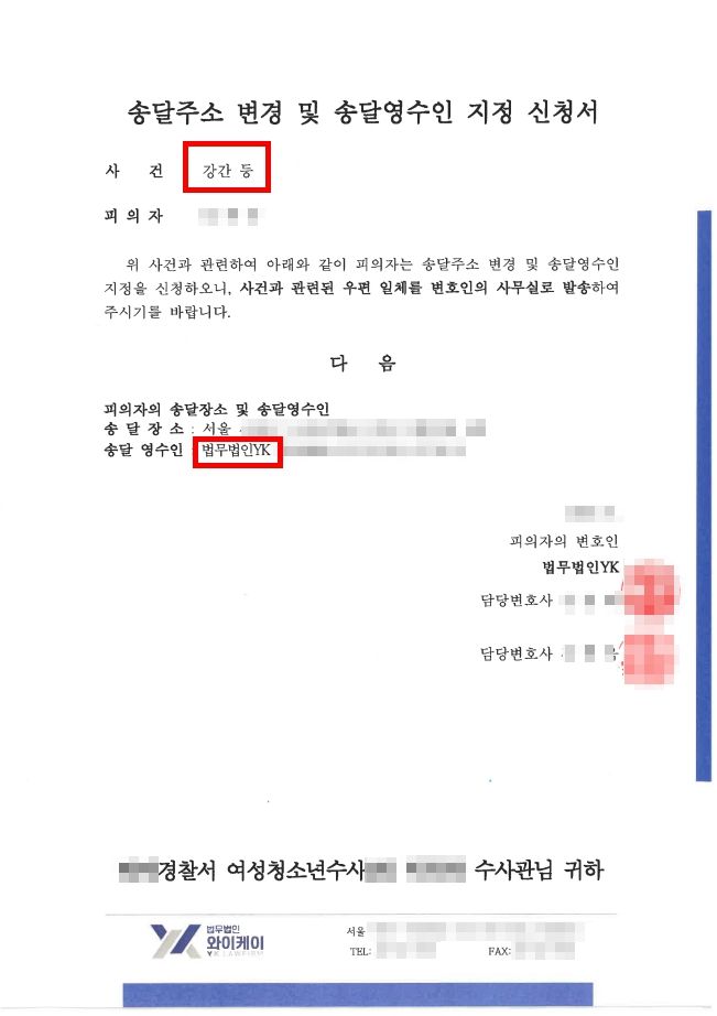 의뢰인의 보호를 위해 사건 관련 우편 일체는 법무법인 YK로 송달지를 변경하였습니다.
